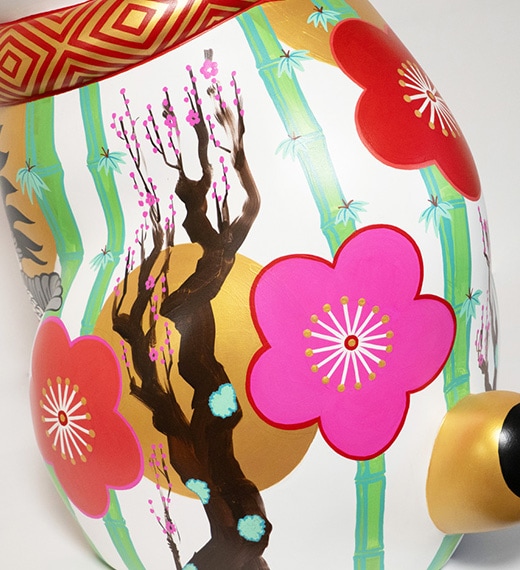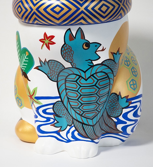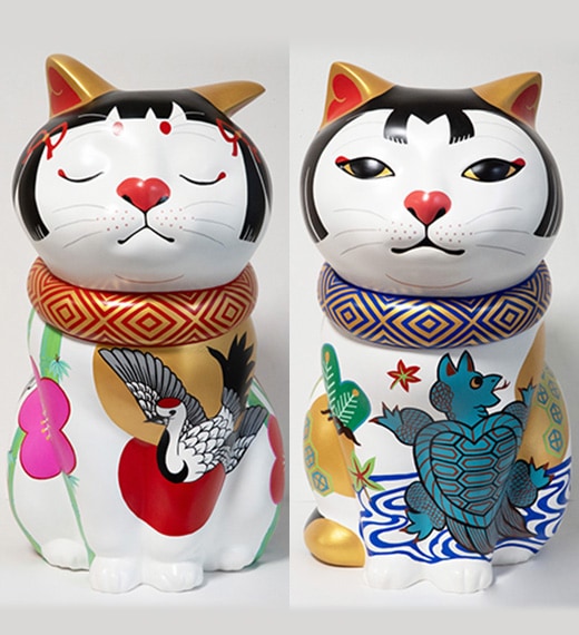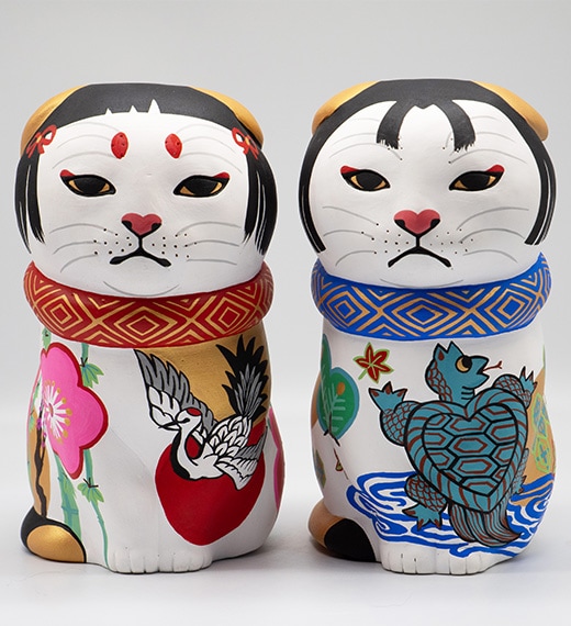 縁起は仏教用語ですが、縁起物は幸せを呼び込むアイテムです。干支の「天馬猫」、吉兆模様を纏った「猫筥♂♀」、そして招福しば犬、厄除け不道明猫など、縁起物のカオデカクンが勢揃いします。 笑う門には福来たる、お気に入りの縁起物を探しに可愛くて、ちょっぴり笑えるカオデカクン達に会いにきてください。エサシトモコ