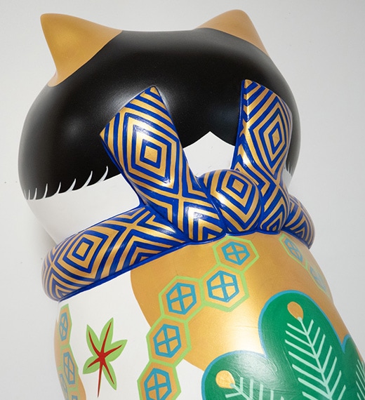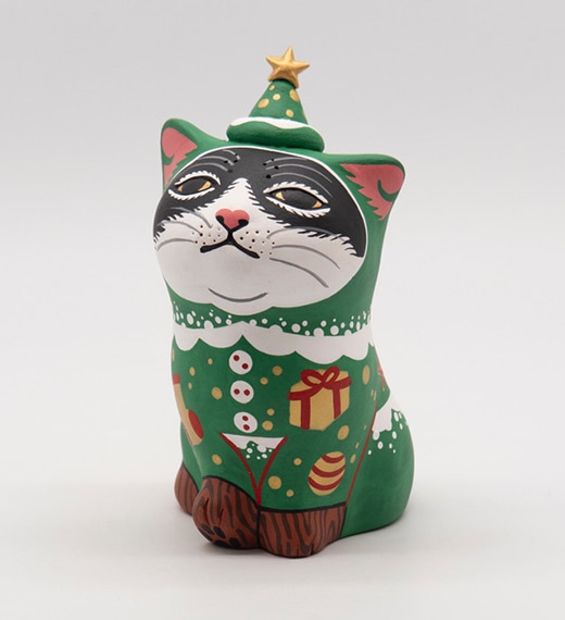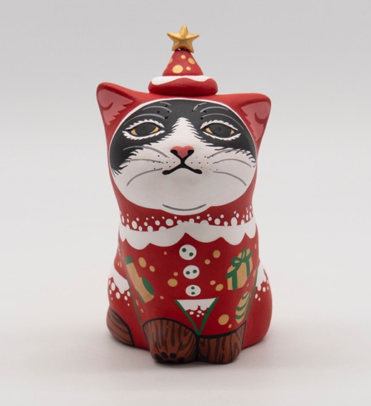 近年の代表作「カオデカクン」は、素焼き(テラコッタ)製の猫の彫刻に顔や毛並みを描き込み多種多様なモチーフを個性豊かに表現した猫型彫刻作品です。