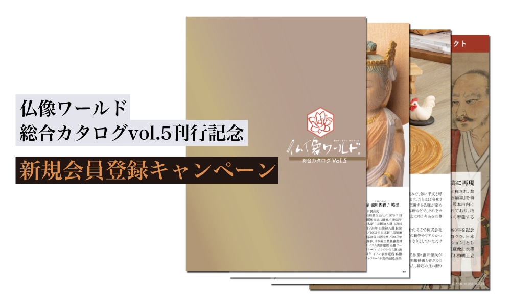 2025年10月、新たに運営する各ブランドから選りすぐりの152点を集めた「仏像ワールド総合カタログvol.5」を刊行いたします。ブランドの一つ「仏像ワールド」の名を冠した当カタログには、名だたる仏師の手による本格木彫仏像を筆頭に、才能豊かな作家の仏像アート、インテリア仏像から関連会社たまふり屋の縁起物やアクセサリーまで、仏像および仏像に関連する多彩な製品を掲載しています。
