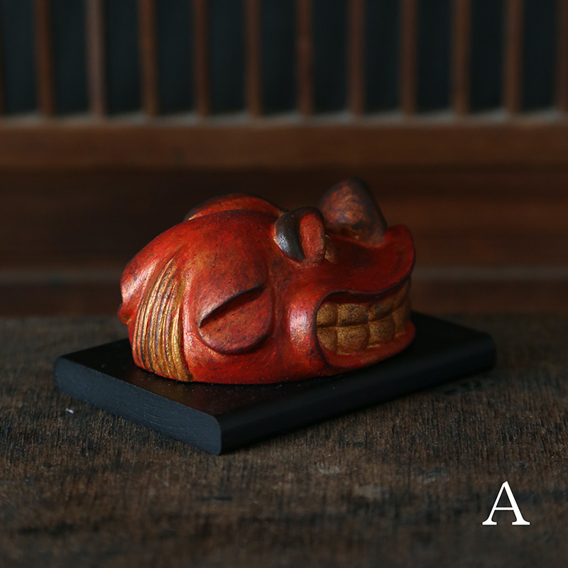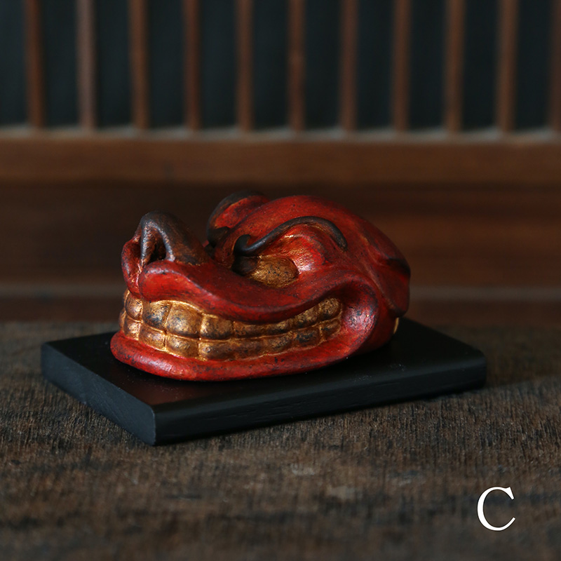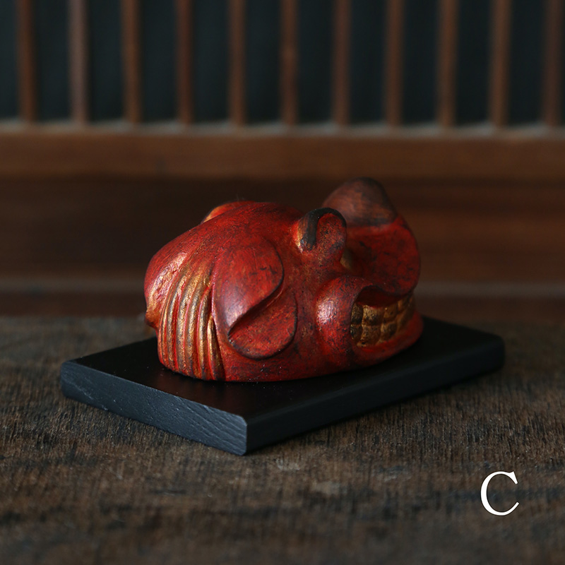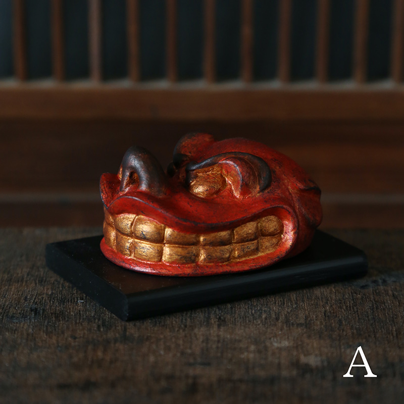 この度は、そんな獅子舞の頭の部分『獅子頭』を塑像で制作しました。特徴的な鮮やかな赤い肌の色や、眉間を寄せてこちらを睨んでいるようにも、また、金の歯を見せて笑っているかのようにも見える愛らしい表情をお楽しみください。
