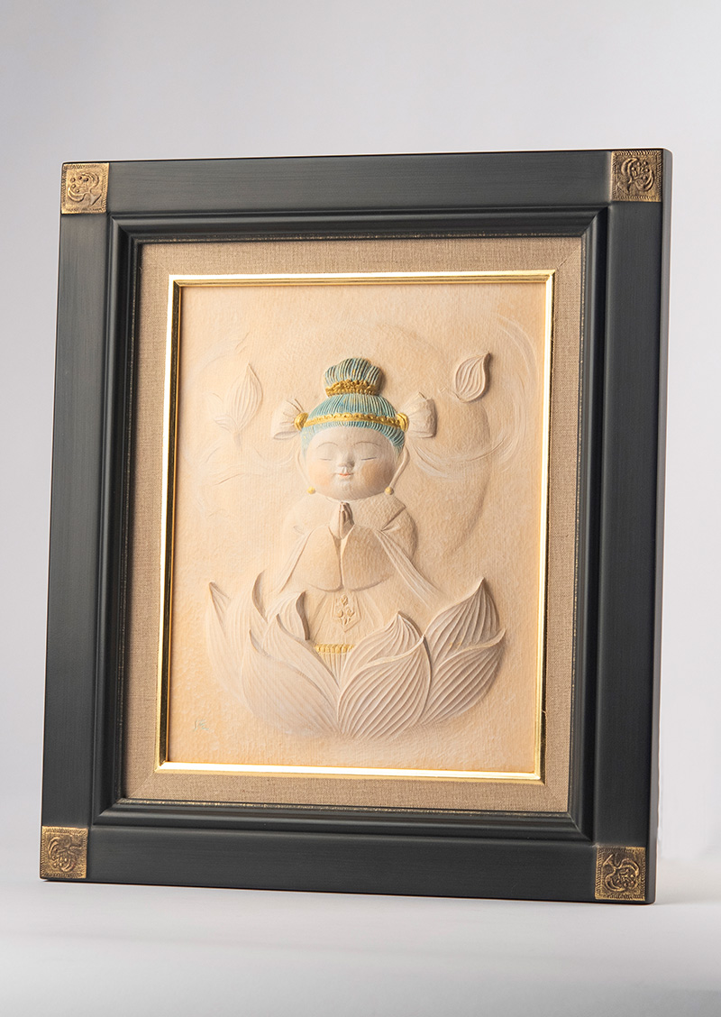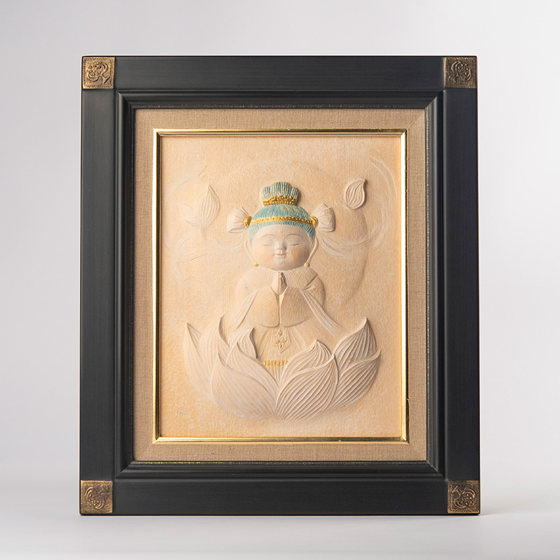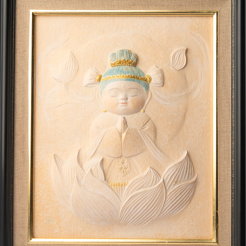 木彫作家 瀧川佐智子による「童観音」のレリーフ彫刻が登場しました。縦40×横34.7cmの額装作品として、壁掛けや床の間などにやさしく寄り添う新たな仏のかたちです。素材には、芳香高く丈夫なヒバ材を使用。童子の姿をとった観音さまが、どこか懐かしく、あたたかく、見る者の心にやさしい余韻を残します。瀧川先生ならではの細やかな彫りと、静けさの中に宿る慈悲のまなざしが、レリーフという平面表現の中でも際立っています。人気の童観音シリーズに、新たな表現が加わることで、より多くの方の祈りの空間や心の拠り所として広がっていくことでしょう。ご自宅の守り本尊としてもおすすめの一枚です。