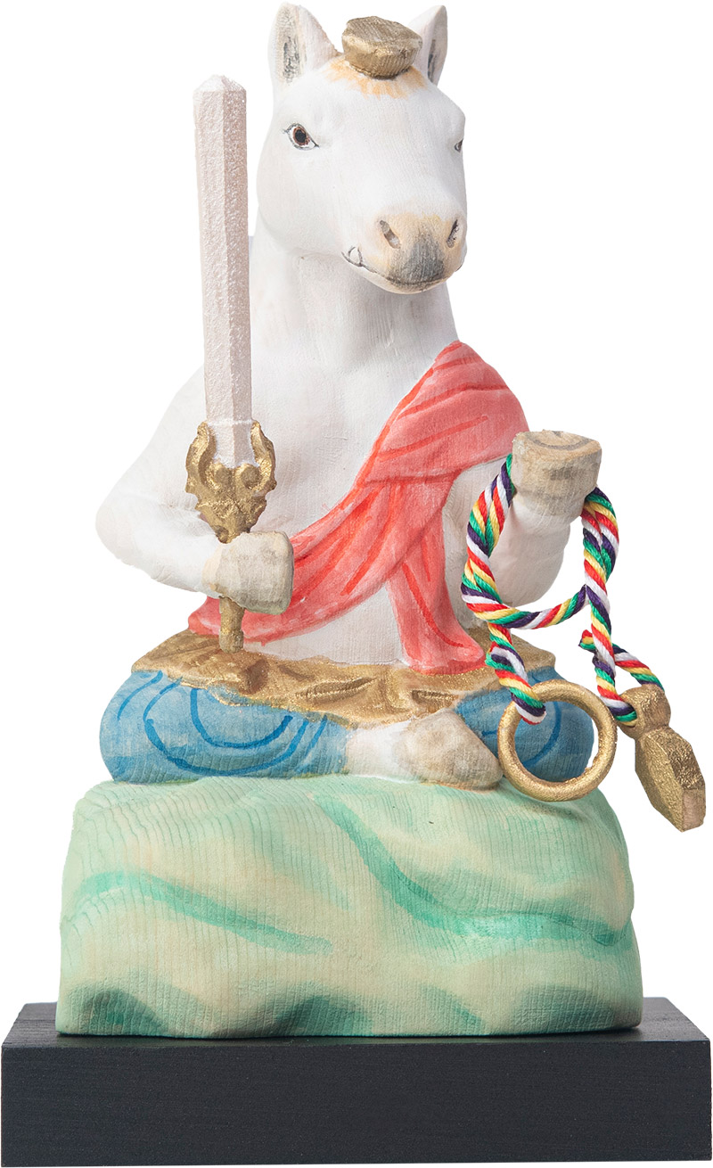 古来、馬は神事に捧げる神馬(しんめ)として、御利益や財運を呼び込む象徴とされてきました。『厄除 午不動尊』がその身を白く彩り、魔除けに通じる赤、財運や豊穣に通じる金、生命力に通じる青を基調とした衣をまとっているのは、神馬を象徴する意匠なのです。また、戦いの場における軍馬はその旺盛な生命力と機動力から勝利を象徴し、行商や農業の場で人や荷を運搬する馬は豊かさを運ぶ存在として大切にされてきました。そもそも生まれて直ぐに立ち上がって歩き始める馬は、古くから立身出世の象徴とされてきました。将棋の駒の産地として有名な山形県天童市には、駒の表面に左右反転させた馬の文字を刻む「左馬(ひだりうま)」という縁起物があります。これは「うま」を逆さにすることで喜びに「まう(舞う)」に通じることを表します。この「左馬」をイメージし、午不動尊は首が僅かに左を向き、尾を右に向けた造形となっています。このように様ざまな縁起要素をその身に宿す『厄除 午不動尊』をお祀りいただくことで、皆さまの令和8年が「何事も馬く行く(上手くいく)」ことを心より祈念いたします。