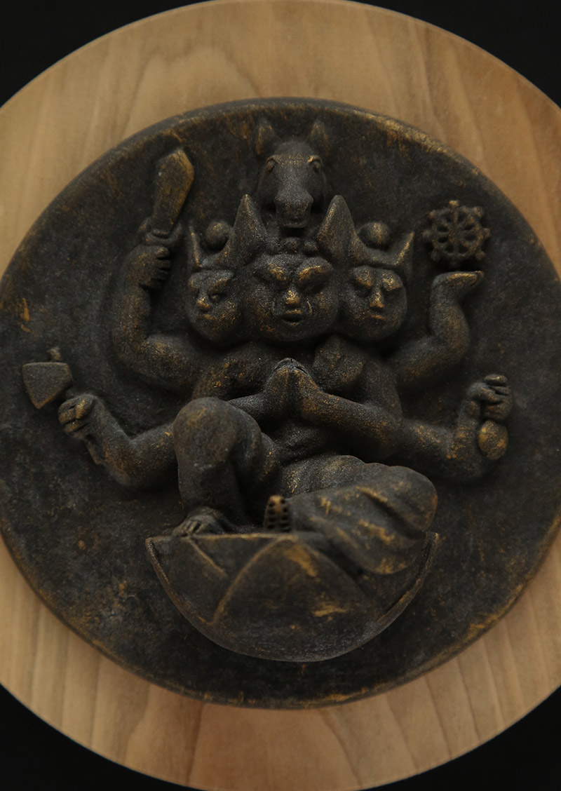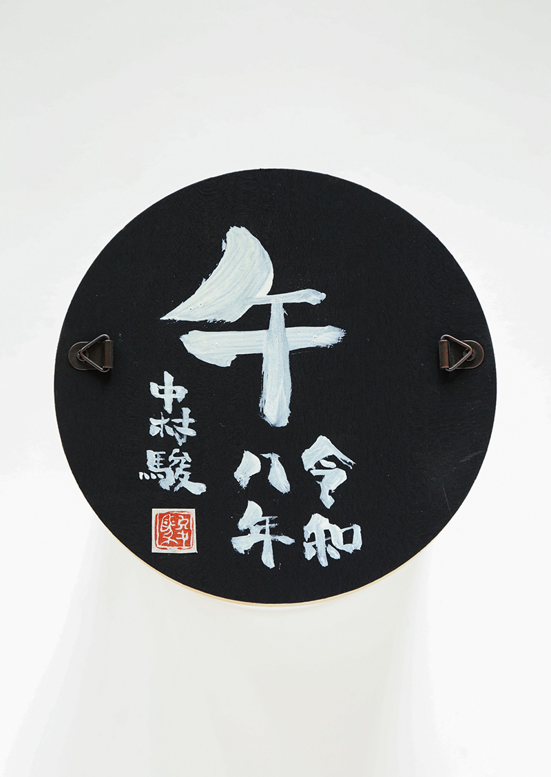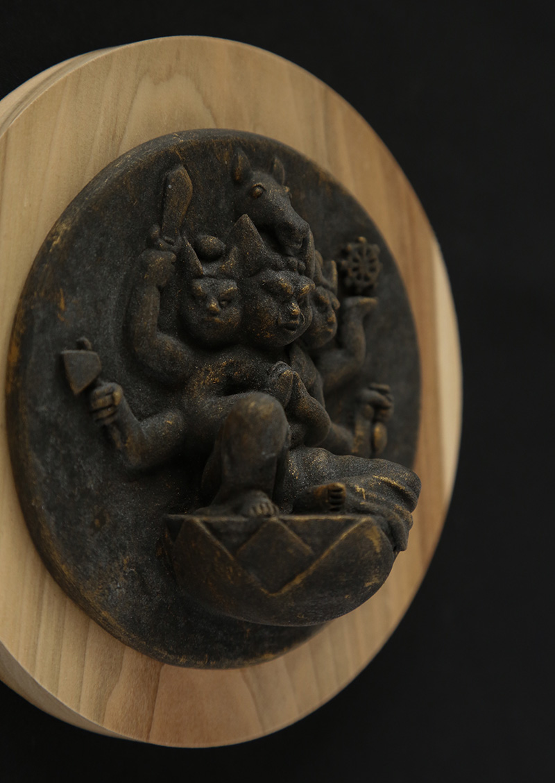 中村駿の『懸仏』は、塑像にアクリルによる古色風の彩色を施し、木の円盤と組み合わせた作品です。2020年の春からシリーズ化し、大胆にデフォルメをした十一面観音菩薩や地蔵菩薩など、穏やかで可愛らしい表情の懸仏を制作してまいりました。本作は、これまでの作品から発展させ、令和八年の干支『午』をテーマにした作品を仕上げました。馬頭観音は、頭上に馬の頭を戴き、憤怒の相をした三面六臂の観音菩薩です。動物(ペット)の健康祈願や病気平癒、また、交通や旅の安全の守護仏として信仰されてきました。本作は小さいお像ではありますが、三面あるご尊顔や持物などの細部にもこだわり作り込んでおります。また、墨の風合いを活かした古色風の表情も特徴の一つです。大切なペットと共に暮らしていらっしゃる方や、旅好きの方のお部屋に飾っていただきたい作品です。